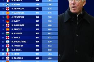 英超主帅得分榜:弗格森809场1752分居首温格第二,瓜帅875分第5