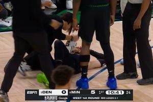体育资讯4月26日讯 森林狼与掘金G4第一节,迪文岑佐在无对抗的情况下,蹬地受伤;