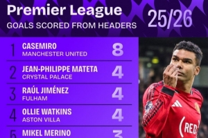 Squawka统计了本赛季球员在英超的头球进球数量,卡塞米罗8球最多,英超历史上仅凯恩(22-23赛季10球)、邓肯·弗格森(97-98赛季9球)单赛季的头球进球更多。
