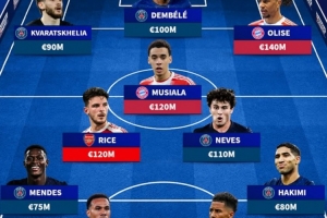 前锋:克瓦拉茨赫利亚(巴黎圣日耳曼,9000万欧元)、登贝莱(巴黎圣日耳曼,1亿欧元)、奥利塞(拜仁慕尼黑,1.4亿欧元)