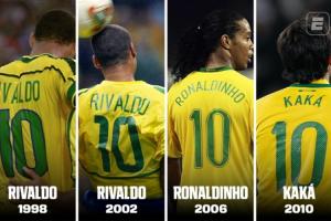 体育资讯04月29日讯 ESPN巴西版今日盘点了近几届世界杯巴西队身穿10号球衣的球员,其中近3届都是内马尔,里瓦尔多、罗纳尔迪尼奥和卡卡在列。