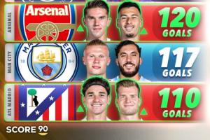但据统计,阿森纳本赛季56场比赛打进120球,马竞54场比赛打进110球,均为五大联赛前6火力。
