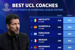 欧冠主帅积分榜:安切洛蒂、瓜迪奥拉、弗格森前三,西蒙尼第六