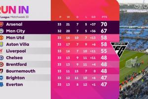 体育资讯04月20日讯 曼城本轮2-1击败阿森纳,曼城少赛1场落后3分,阿森纳净胜球37,曼城36。